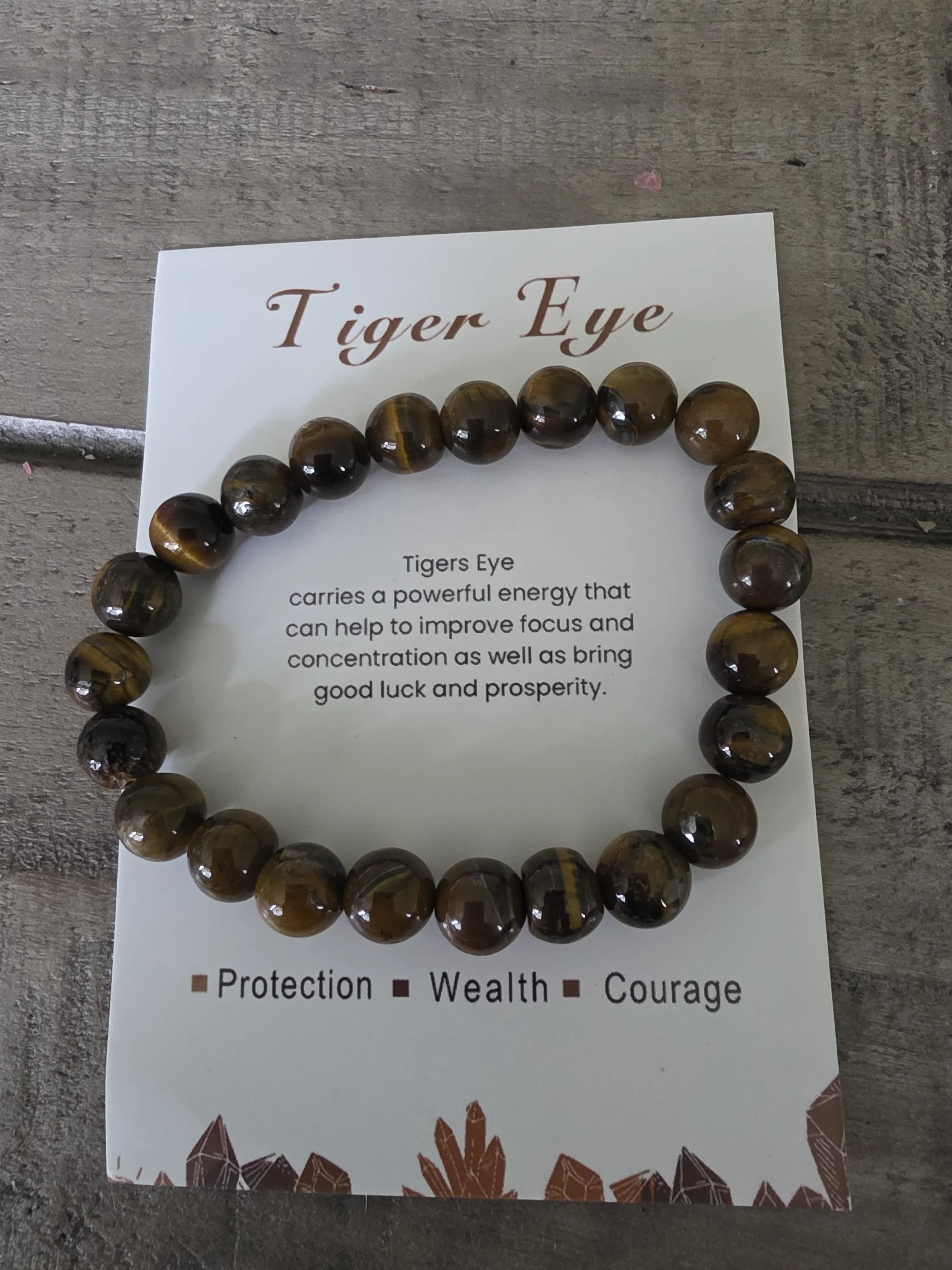 Shop › Tiger Eye bracelet Image 1 of 2 Image 2 of 2 Tiger Eye bracelet $12.00 Tiger eye protection, wealth, courage improves focus, and concentration I bless each one personally ships to USA ONLY Add To Cart Added! Tiger eye protection, wealth, courage improves focus, and concentration I bless each one personally ships to USA ONLY