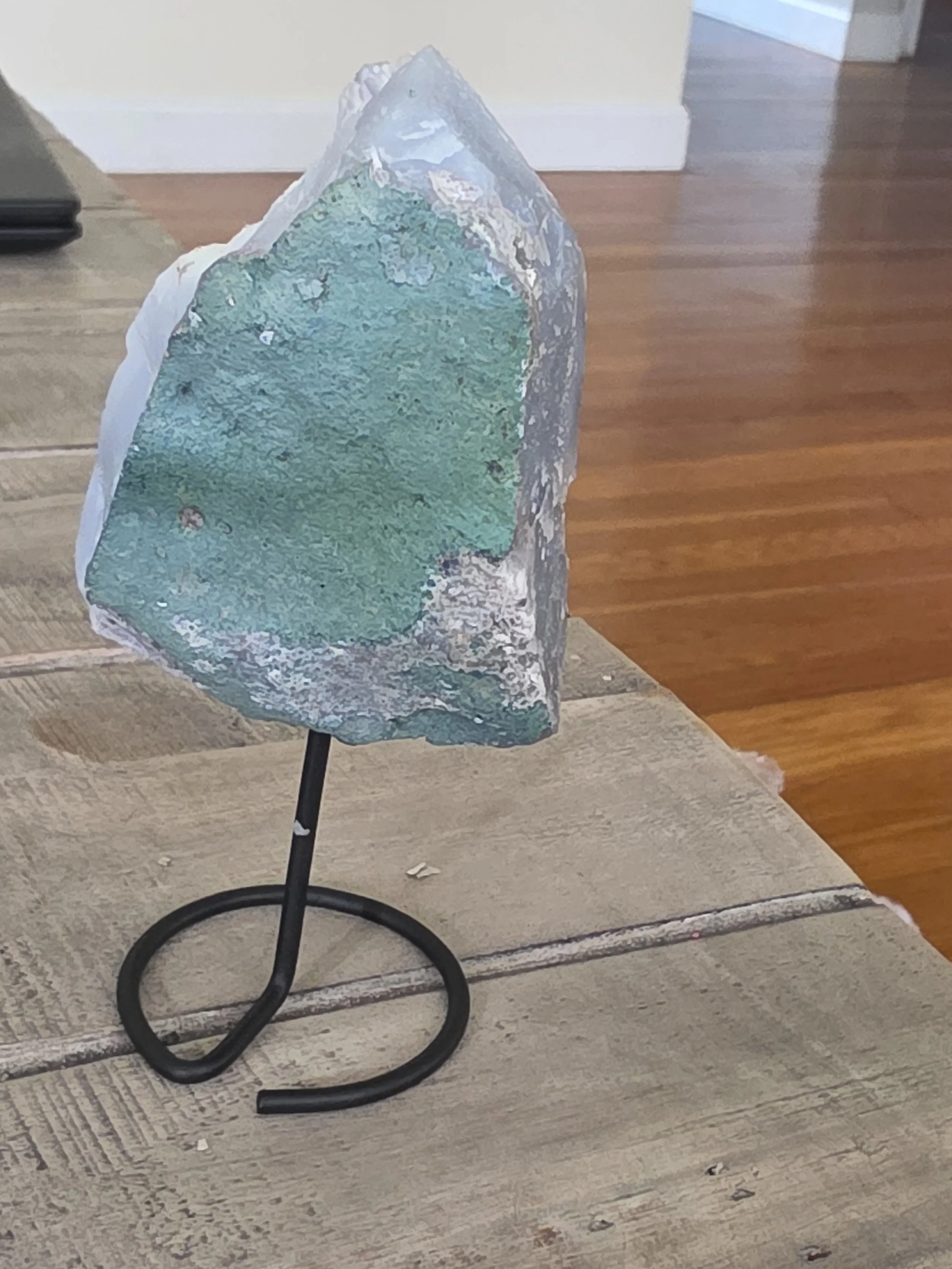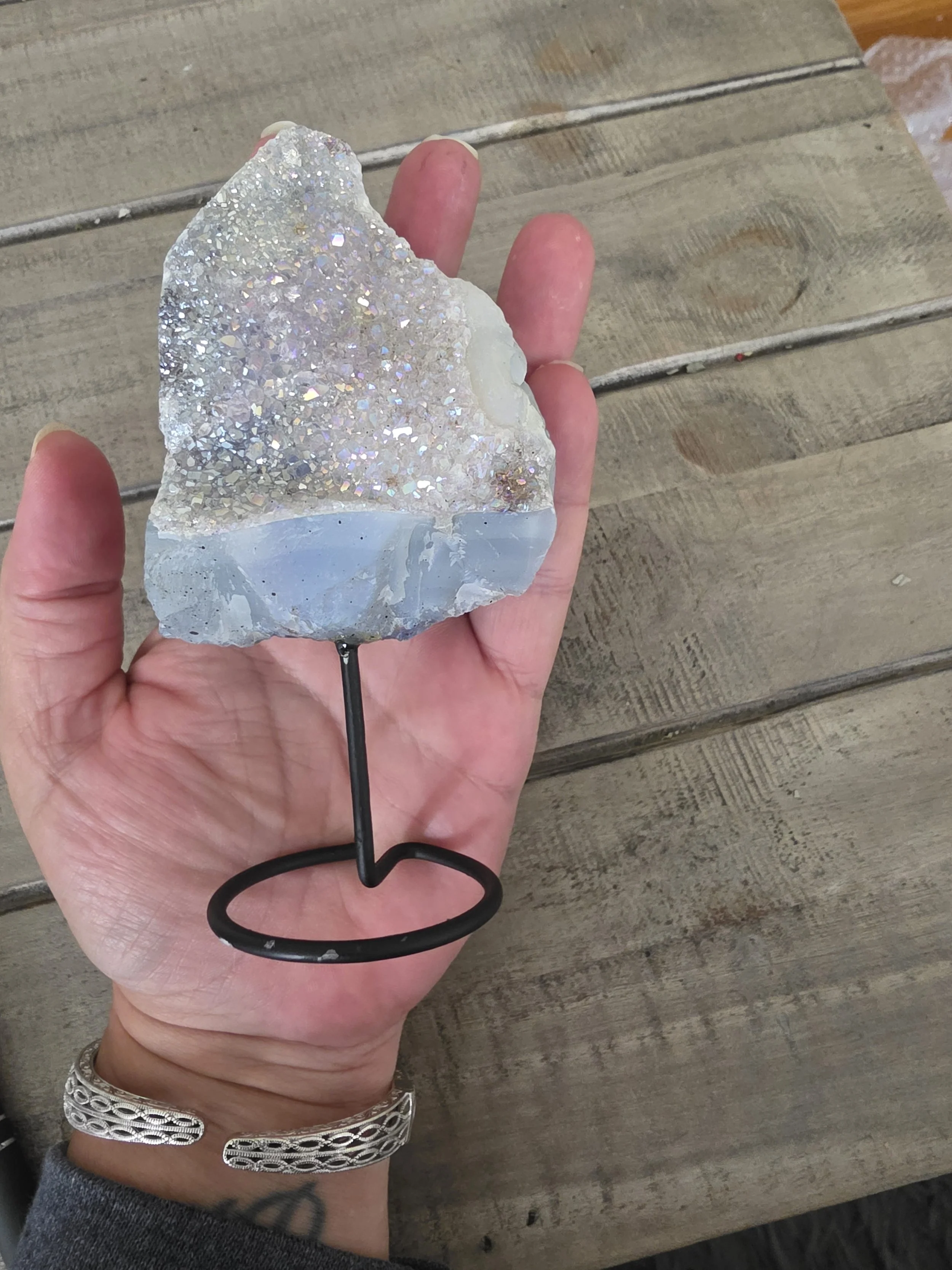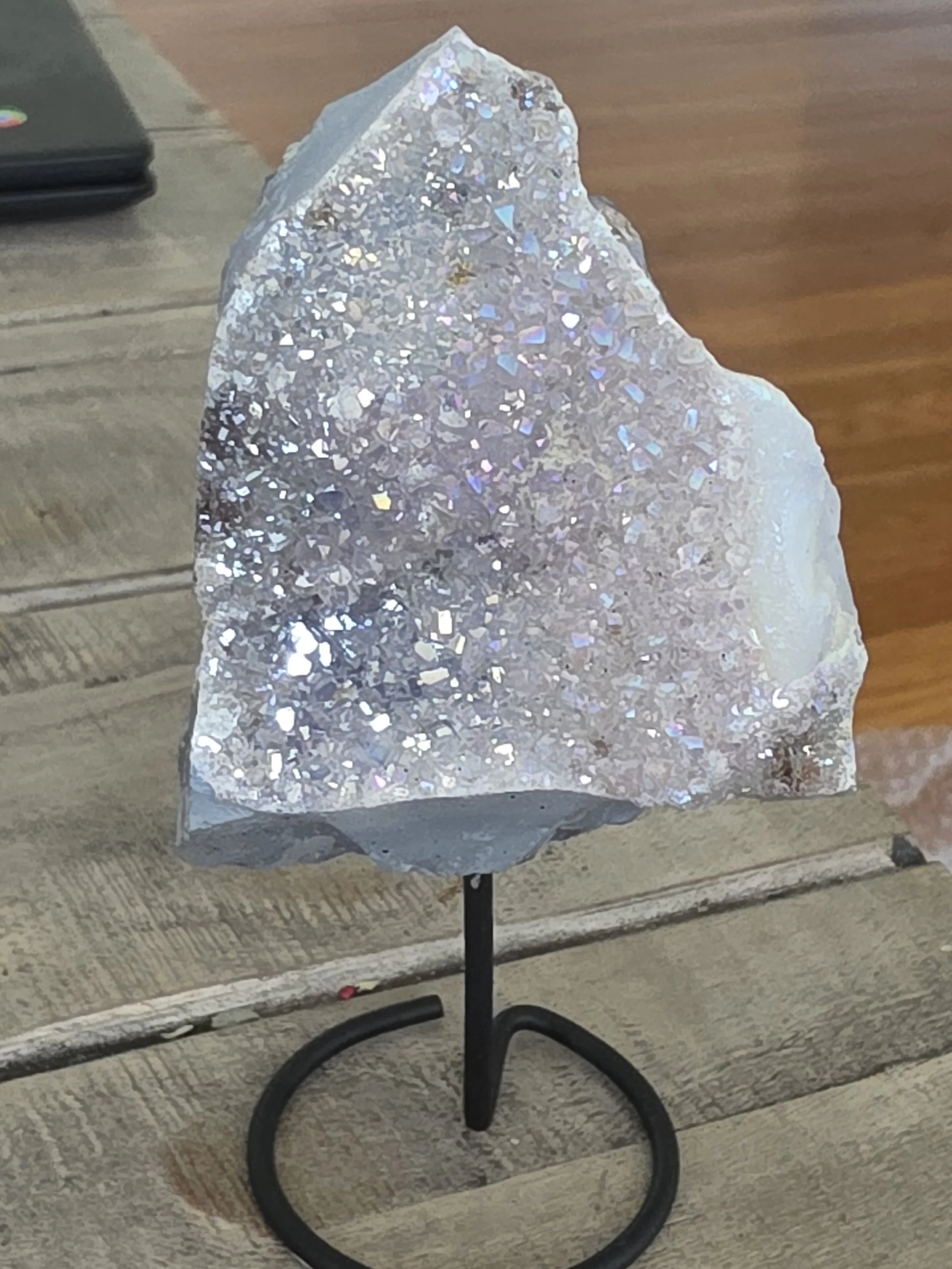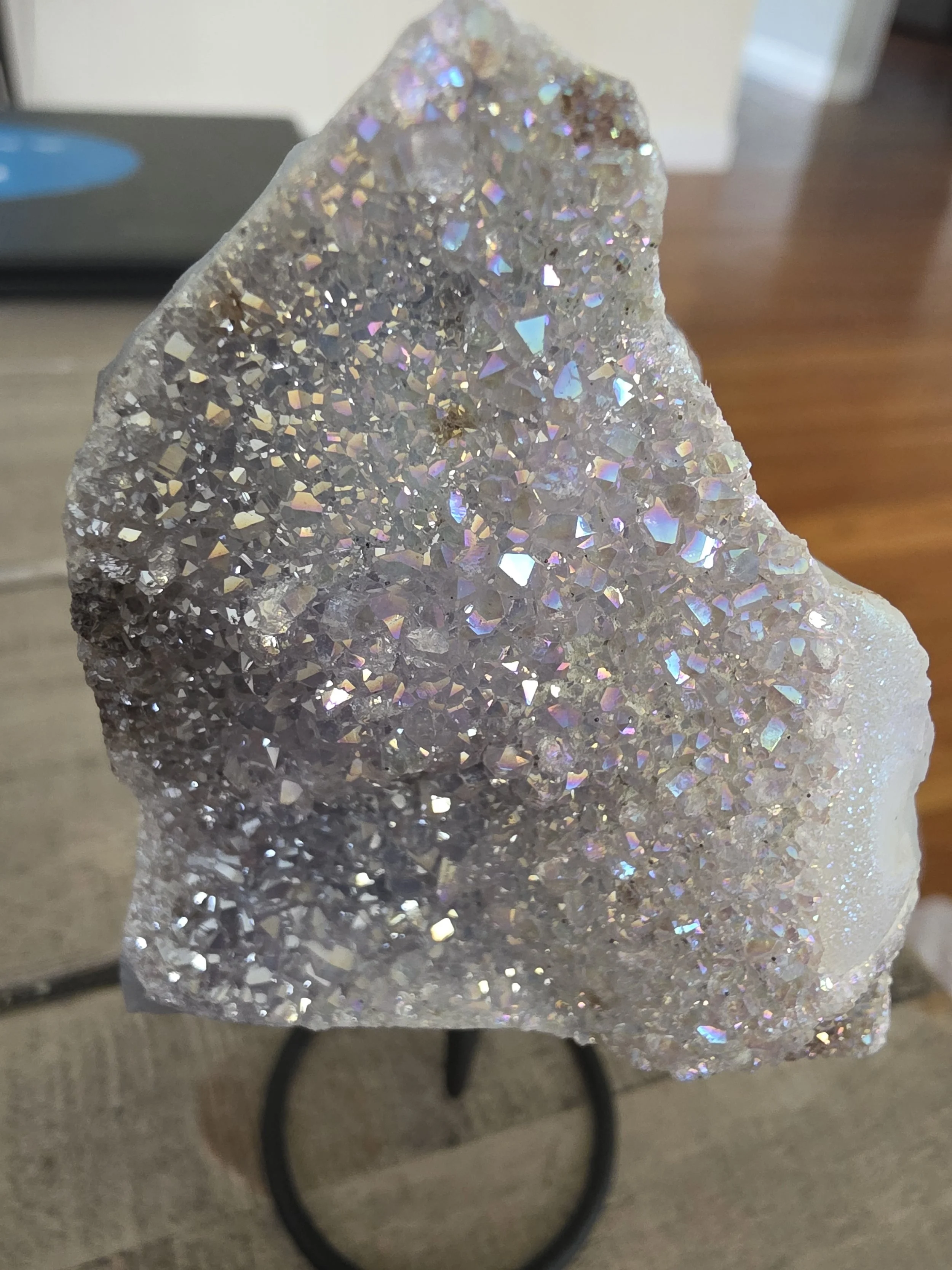 Aura amethyst druzy is a treated, high-vibration stone created by bonding natural amethyst with precious metals, such as platinum or titanium, producing an iridescent, rainbow-like sparkle. It combines the calm and spiritual protection of amethyst with enhanced, uplifting energy, fostering serenity, emotional healing, and angelic connection.